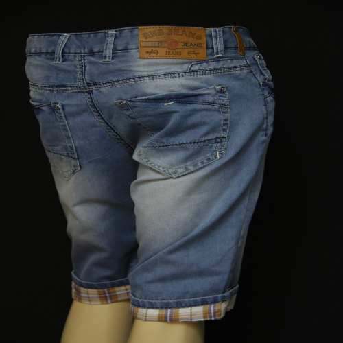 Bermudas leger , en toile de jeans facon chambray , revers a carreaux au bas du bermudas ,coupe cinq poches comme un jeans , fines surpiqures blanches, fermeture du bermudas a zip.