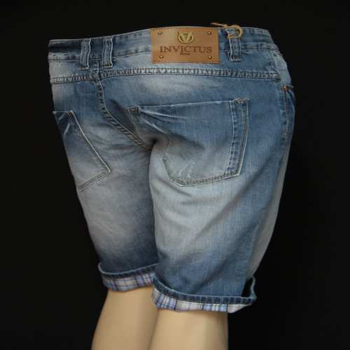 Bermudas en jeanshachuré legerement , revers a carreaux au bas du short , coupedroite ,cinq poches comme un jeans , ce modele vous seduira par sa coupe et son bleu delavé.
