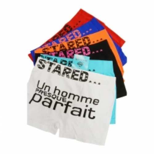 Joli boxer homme avec inscription "Un homme presque parfait", offert par lot de 24 à mini-prix sur ventegros.fr (1.75 € / Unité). Marque étoilée imprimée sur la taille. Tailles assorties : S/M, L/XL. Couleurs assorties. Matière : 90% polyamide, 10% élasthanne. Pour plus d’informations, contactez notre service client au Tél : 09 74 77 14 80 ou envoyez-nous un mail sur cette adresse : contact@ventegros.fr.