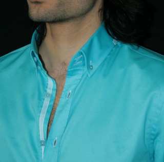 Chemise classique uni turquoise, coupe italienne slim fit de la marque Zafferano. Modèle a la fois chic et tendance grâce a son liserais blanc discret a l’extérieur du col ainsi que l’intérieure de la boutonnière et aux manches. Découvrez aussi cette chemise en vert, blanc et en noir.