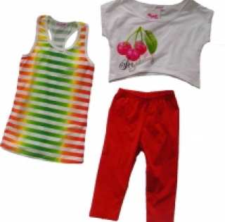 Déstockage de joli ensemble 3 pièces pour filles composé d’un débardeur à rayures, d’un t-shirt loose court avec motif cerise et d’une leggings assortie, vendu par lot de 20 à prix compétitif (4.72 € / Unité). Ensemble fabriqué majoritairement en coton. Disponible en couleurs assorties : blanc, vert, fuchsia et vert. Tailles : 4-12 ans. Pour plus d’informations, contactez notre service client au Tél : 0974771480 ou envoyez-nous un mail sur cette adresse : contact@ventegros.fr.