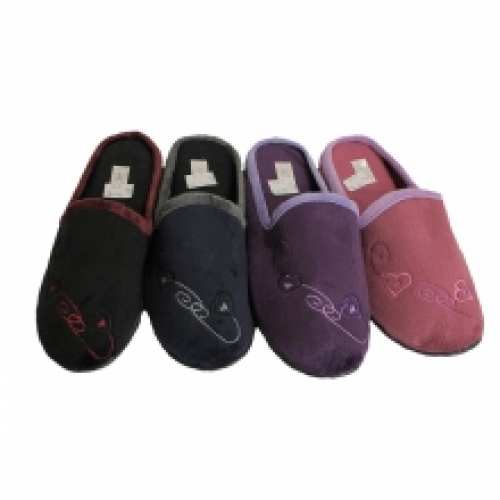 Pantoufles avec liseré contrastant ornées de broderies et semelle antidérapante, livrés par lot de 50 paires à mini-prix sur ventegros.fr (2.02 € / Unité). 4 couleurs assorties : noirx25, violet foncéx5, bleu foncéx10, magentax10. Pointures : 36-41. Pour plus d’informations, contactez notre service client au Tél : 09 74 77 14 80 ou envoyez-nous un mail sur cette adresse : contact@ventegros.fr.
