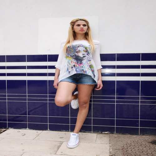Tunique legere avec en serigraphie avec un visage de femme sur la poitrine style geisha recoloré, imprimé numerisé sur la poitrine ,matiere appelé crepe gorgette , fluide et douce
