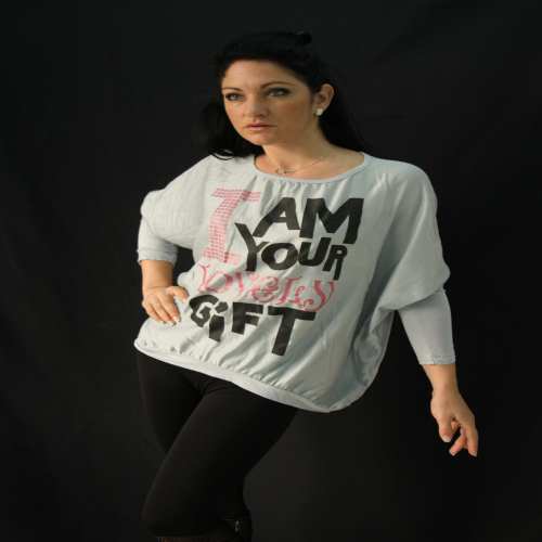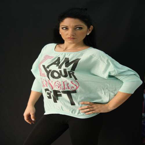 Très jolie tunique femme taille moyenne, manche trois quart « chauve-souris » col rond ; ce modèle est composer de soie sur la poitrine et de coton au dos. Sérigraphie et strass sur la poitrine. A découvrir exclusivement chez Kalliente, de fabrication Italienne, ce model existe en vert pale, cerise, corail, blanc, café et noir.
