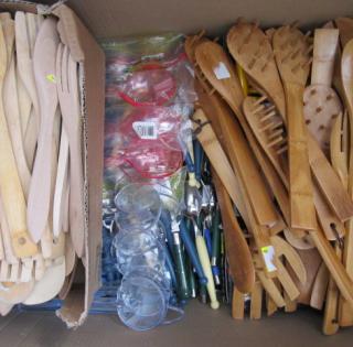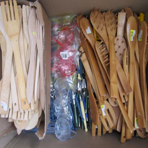 7 Mélangeurs salade, pates, 17 Couverts salade plastiques (X 2), 73 Fourchettes et cuilleres bois,