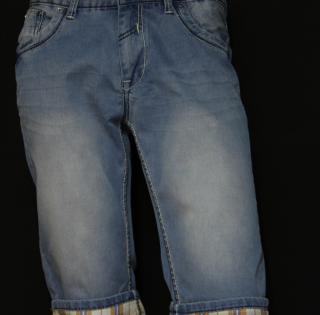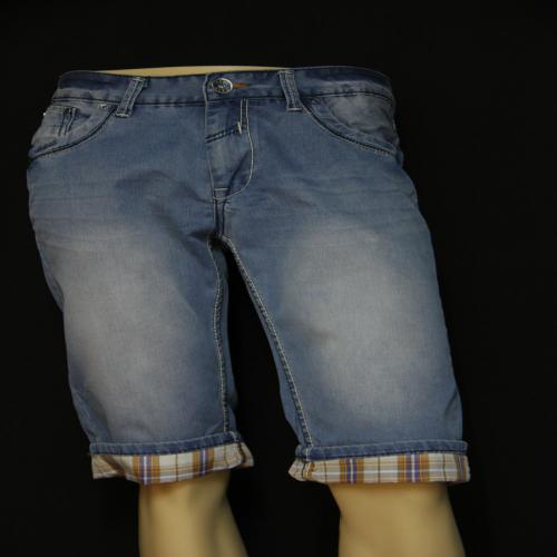 Bermudas leger , en toile de jeans facon chambray , revers a carreaux au bas du bermudas ,coupe cinq poches comme un jeans , fines surpiqures blanches, fermeture du bermudas a zip.