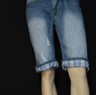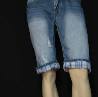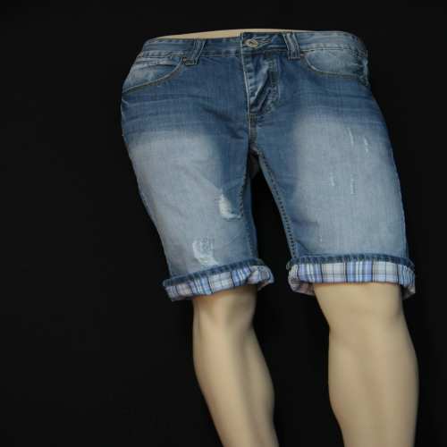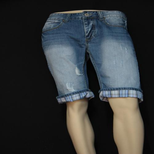Bermudas en jeanshachuré legerement , revers a carreaux au bas du short , coupedroite ,cinq poches comme un jeans , ce modele vous seduira par sa coupe et son bleu delavé.