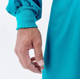 Blouse médicale Casaque chirurgicale a bavette Vert. mixte, fermeture dos avec lacets et velcros, poche poitrine et bavette, manches longues. (poignets tricot bleu ciel).