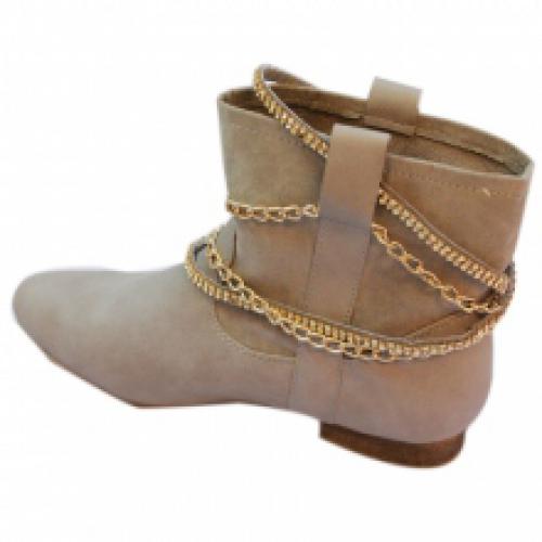 Superbes bottines grises fabriquées en premier cuir, ornées de brides cloutées et chaînes dorées, vendues à petit prix (13.50 € / Unité). Disponible en pointure : 36-41.