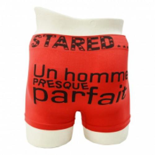 Joli boxer homme avec inscription "Un homme presque parfait", offert par lot de 24 à mini-prix sur ventegros.fr (1.75 € / Unité). Marque étoilée imprimée sur la taille. Tailles assorties : S/M, L/XL. Couleurs assorties. Matière : 90% polyamide, 10% élasthanne. Pour plus d’informations, contactez notre service client au Tél : 09 74 77 14 80 ou envoyez-nous un mail sur cette adresse : contact@ventegros.fr.
