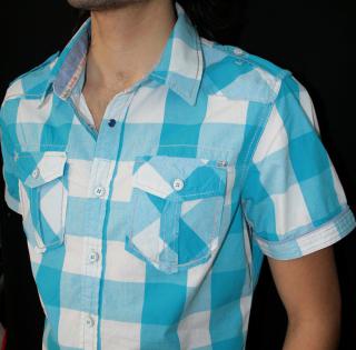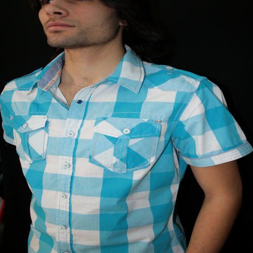 Chemise « western » a gros carreaux, manches courtes, surpiqures blanches, deux poches poitrines, a rabat .intérieur du col retravaillé, ainsi que le bord des manches retravaillé de trois surpiqures claires. Broderies sur la manche gauche, et sur la poche gauche. Flocage discret au dos sur la bordure. Martingales aux épaules. Cette chemise se décline en turquoise, rouge et marine.