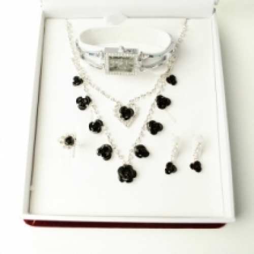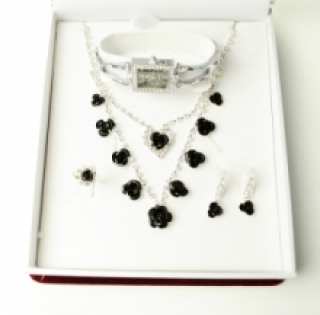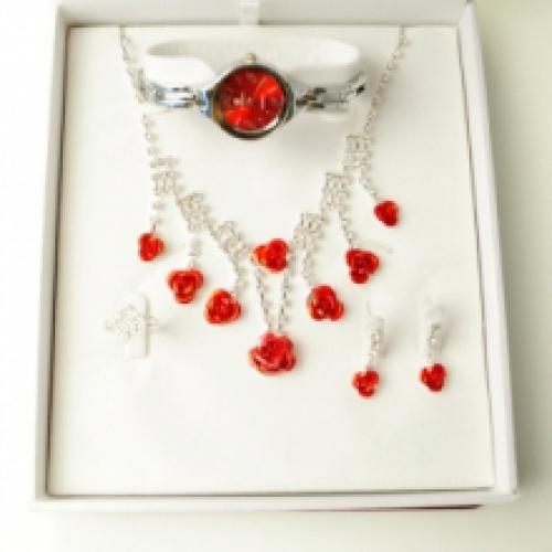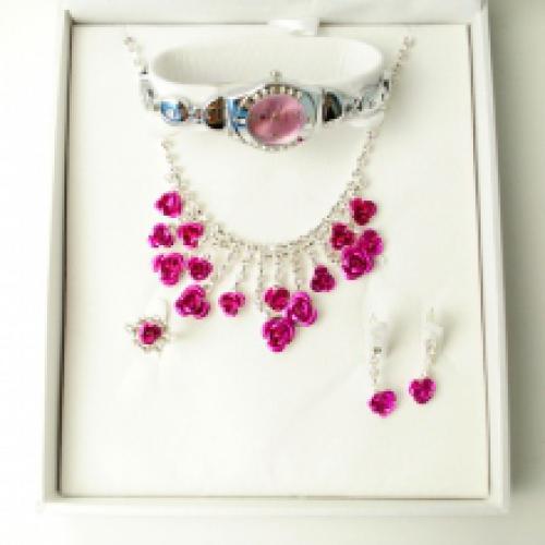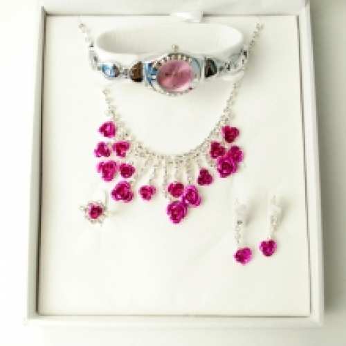 Coffret cadeau contenant des luxueux bijoux pour femme. Une parure bijou en roses avec strass dont une jolie bague, un collier, des boucles d'oreilles fermées par puces ainsi qu'une sublime montre ornée de strass avec un cadran rose pour la beauté éblouie des femmes. Un sublime cadeau à donner à l'être aimé ou à s'offrir tout simplement. Disponible en couleurs assorties et taille unique. Coffret offert par lot de 3 à prix compétitif (6.75 € / Unité). Pour plus d’informations, contactez notre service client au Tél : 09 74 77 14 80 ou envoyez-nous un mail sur cette adresse : contact@ventegros.fr.