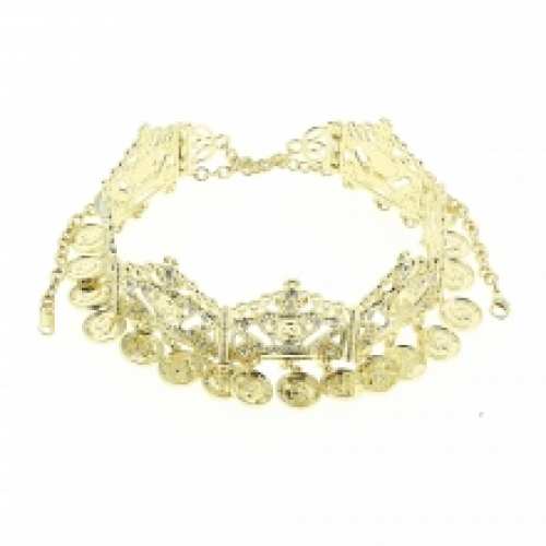 Êtes-vous une adepte du style oriental ? Apportez une touche incomparable à votre chevelure en optant pour cette somptueuse couronne de reine orientale plaquée or incrustée de strass et bordée de pendeloques motif floral ou pièce de monnaie. Elle s'ajuste facilement à toute tête au moyen du fermoir par chaînette à l'arrière. Ventegros vous l'offre à prix défiant toute concurrence (11.48 € / Unité). Couleur : doré. Taille unique. Pour plus d’informations, contactez notre service client au Tél : 09 74 77 14 80 ou envoyez-nous un mail sur cette adresse : contact@ventegros.fr.