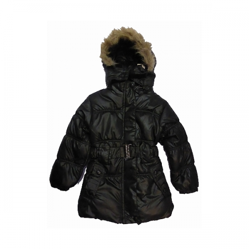 doudoune à capuche bordée de fausse fourrure et ceinture.