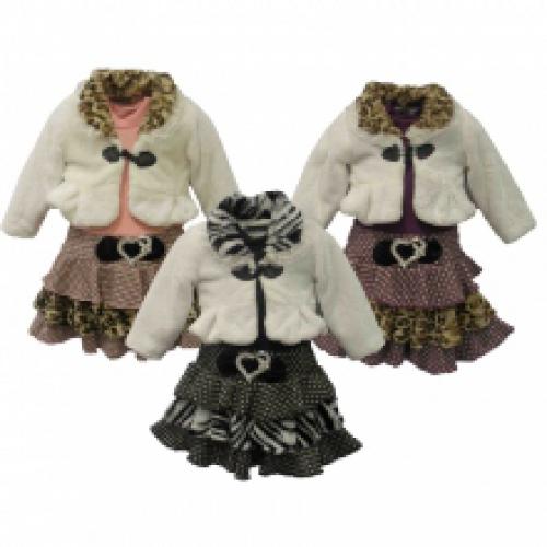 Un des habillements tendance et nécessaire pour une tenue hivernale chic aux fillettes. Ensemble composé d'une robe à col roulé et volants avec une fausse ceinture à boucle coeur papillon strass devant, accompagnée d'une veste fausse fourrure avec col à dentelle et motif zébré. Ventegros.fr vous livre l’ensemble de 15 à un prix défiant toute concurrence (7.83 € / Unité). Matière : 35% coton, 65% polyester. Couleurs assorties : rose, noir, violet. Taille : 2-10 ans. Pour plus d’informations, contactez notre service client au Tél : 09 74 77 14 80 ou envoyez-nous un mail sur cette adresse : contact@ventegros.fr.