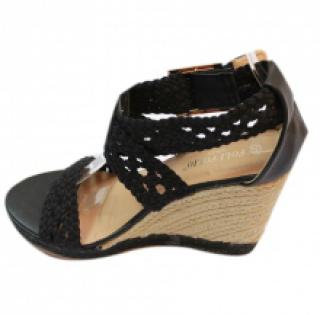 Espadrilles compensées noires avec brides larges crochetées et croisées sur le cou-de-pied, vendues par lot de 12 paires à petit prix (10.00 € / Unité). Modèle équipé d’une boucle dorée, monté sur une semelle en corde tressée et semelle d’usure en caoutchouc antidérapant. Disponible en tailles : 36-41. Pour plus d’informations, contactez notre service client au Tél : 0974771480 ou envoyez-nous un mail sur cette adresse : contact@ventegros.fr.
