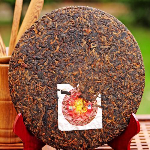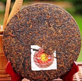Galette de thé pu-erh cuit du Yunnan 357g cuvée spéciale Long Bing: Galette du Dragon, année de récolte 2011, cueillettes supérieures, lieu de production: Yunnan, Xishuangbanna, Menghai.
