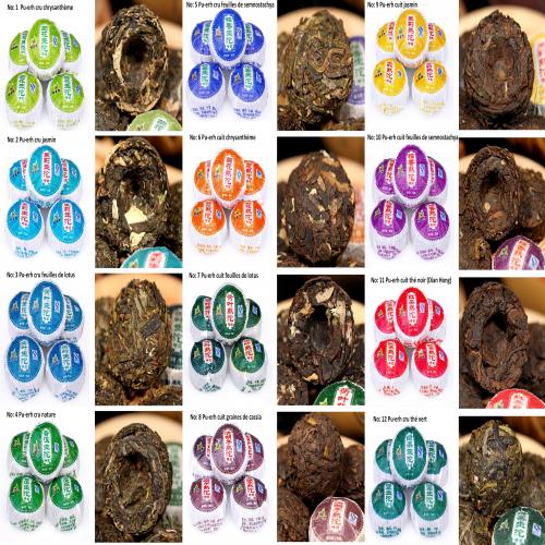 parfums disponibles: pu er cru et chrysanthème, pu erh cru et jasmin, pu er cru et lotus, pu er cru nature, pu er cru et semnostachya menglaensis nuomixiang (herbe sauvage et naturelle du sud-ouest de la chine), pu er cuit et chrysanthème, pu er cuit et lotus, pu er cru et graines de cassia, pu er cuit et jasmin, pu er cuit et semnostachya menglaensis, pu er cuit et thé noir (dian hong), pu er cru et thé vert, thé noir dian hong nature, pu er cuit et rose, pu er cuit et fruit de luohan... .