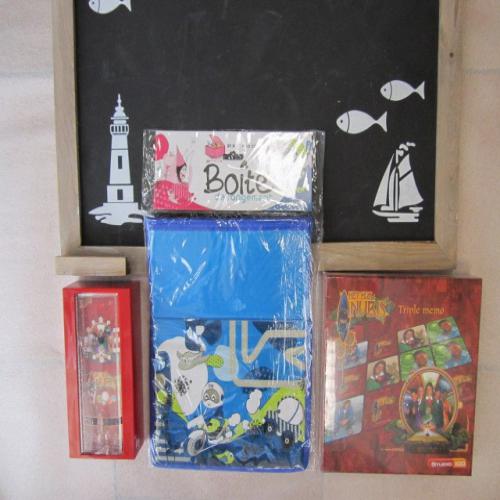 Jeux mémo, pendulettes Anubis, boîtes de rangement, Tableaux à craie