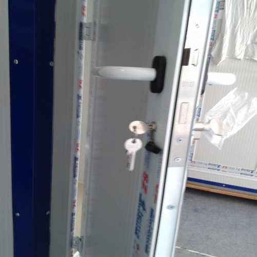Porte enAcier ou aluminium avec fermeture à l’extérieur à l'aide d' une serrure à barillet et d' un jeu de trois clefs.