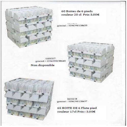 , box de 65 verre à flute : 28cl , prix : 2.50€, gencods : 1611421