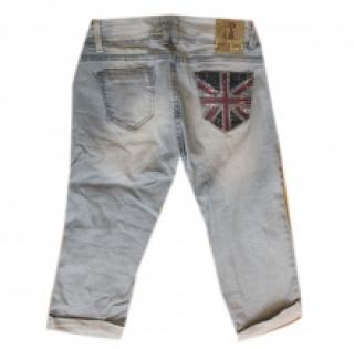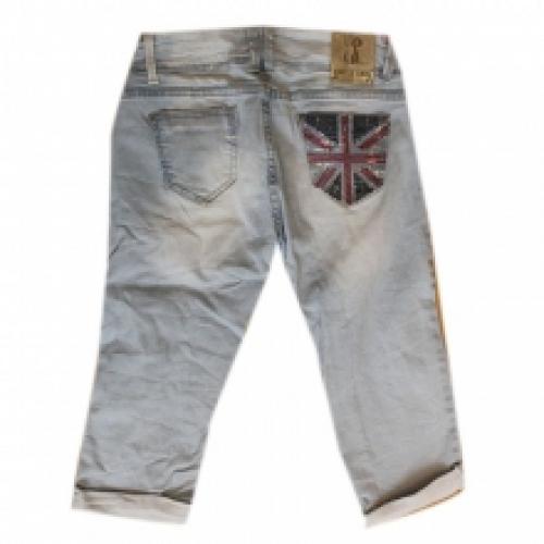 Pantacourt multipoche en jeans délavé vendu par lot de 10 pièces à petit prix (10.80 € / Unité). Fabriqué majoritairement en coton. Modèle équipé de deux poches cavalières, une poche ticket Union Jack en sequins devant et de deux poches plaquées à l'arrière dont l'une est de motif Union Jack en sequins également. Disponible en couleur unique. Tailles assorties : 34-36-38-40-42. Pour plus d’informations, contactez notre service client au Tél : 0974771480 ou envoyez-nous un mail sur cette adresse : contact@ventegros.fr.