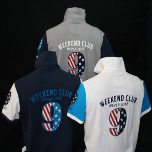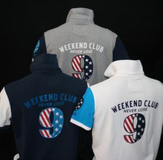 Polo sportswear, manches courtes, bord des manches bicolore. Col trois boutons , intérieur de la boutonnière bicolore, très beau model au sérigraphies et broderies sur la poitrine, ainsi qu’une broderie du chiffre 9 sur la manche gauche au couleur du drapeau américains. Poitrine bicolore. Dos retravaillé de broderie et texte serigraphié « WEEKEND CLUB »