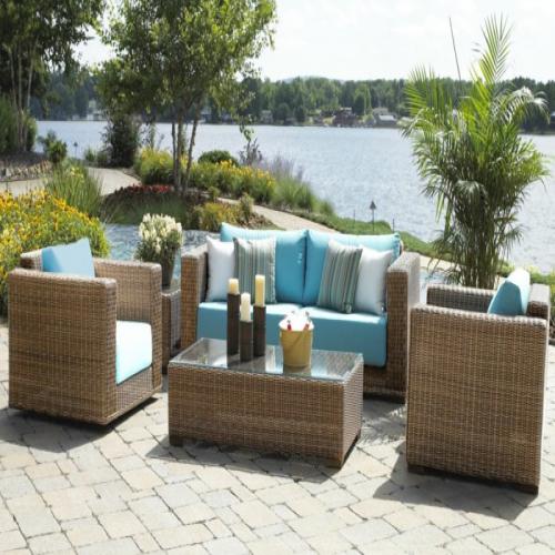 Large gamme de mobilier d'exterieur en wicker comme ce salon compose de 1 canape 3 places, 2 fauteuils et 1 table basse vitree pour 300 euros TTC seulement !