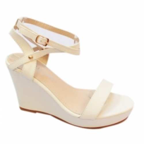 Ravissantes sandales compensées blanches façonnées en premier cuir, vendues par lot de 12 à petit prix (6.00 € / Unité). Ornementées par des brides croisées avec boucles et rivets dorés au niveau de la cheville. Pointures assorties : 36-41.