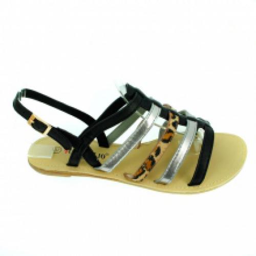 Paire de sandales noires avec brides en trois tons (noires, léopards et argentées), livrées par lot de 12 à prix abordable (6.00 € / Unité). Sandales façonnées en similicuir. Montées sur une semelle d'usure en gomme antidérapante. Pointures assorties : 36-41. Pour plus d’informations, contactez notre service client au Tél : 0974771480 ou envoyez-nous un mail sur cette adresse : contact@ventegros.fr.