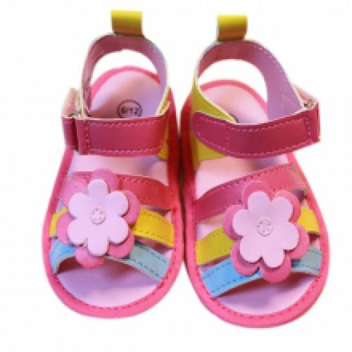 Sandales bébé tricolores à petit prix (4.05 €/ unité) décorées de motif fleurs et avec scratch sur la cheville. Disponible en couleurs assorties et en taille 6/12, 12/18, 18/23. Vendues par lot de 12.