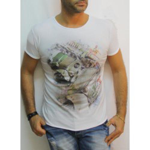 Tee shirt à manches courtes, imprimé sur la poitrine.