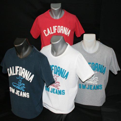 Tee shirt manches courtes col rond, poitrine toutes retravaillée sérigraphies et broderies texte "California" . Ce modèle de tee shirt de la marque Enos, se décline en 4 coloris : blanc, rouge, marine et gris claire.