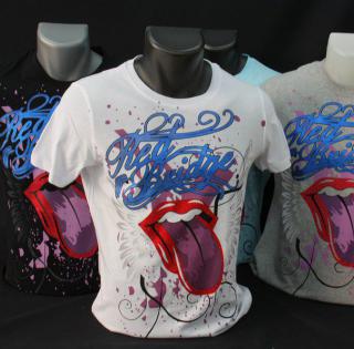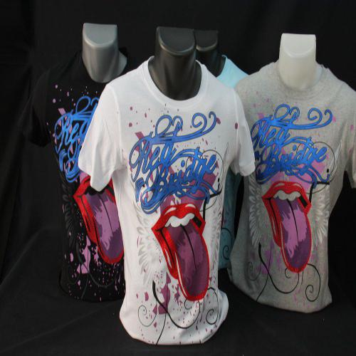 Tee-shirt FASHION, manches courtes, col rond, sérigraphie coloré et gaie d’une bouche de femme style « Rolling Stone » très beau model de tee shirt d’été au coloris gris, noir, turquoise, et blanche.